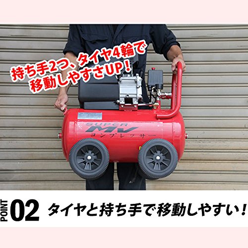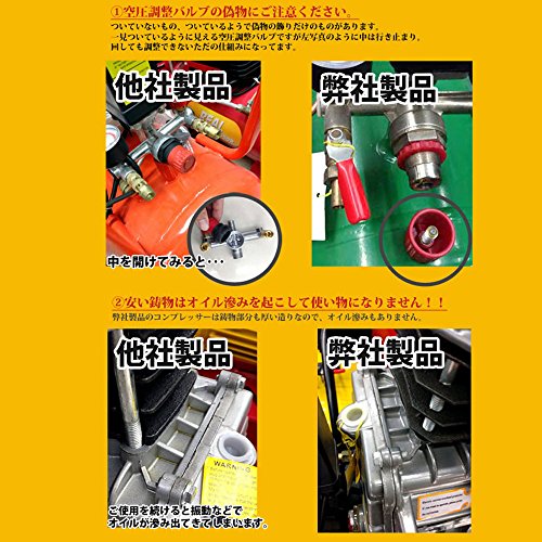 - 備考 ・起動時電圧ドロップを90V前後まで起すコンセントでの使用は出来ません。・大きな電圧を必要としますので、タコ足配線や延長コードでの配線のご使用は出来ません。・空気を圧縮すると水滴が発生しますので、使用後は必ずドレン抜きバルブを開いてください。・長期間ご使用いただくために、定期的なオイル交換が必要となります。・連続使用は1作業、10分以内でお願いします。・破損防止のためエアーカプラ、エアーフィルター、タイヤはご自身でお取り付けください。
