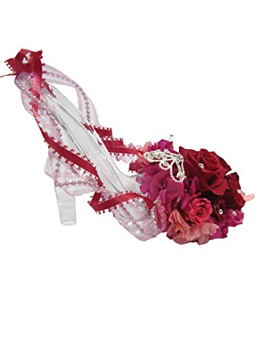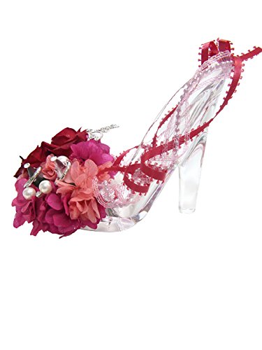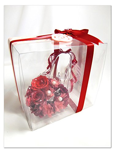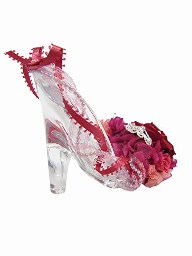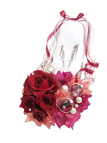 ガラスの靴に赤い薔薇とベリー色の濃淡のある紫陽花を使用。赤い薔薇の種類も三種類使用し、お花にはキラキラとした上品なキラメキとティアラやパール、スワロフスキーの装飾がまるで宝石の靴のようにキラキラとしています。靴の回りには2種類のリボンで飾り、華やかなボリューム感を演出しました。サイドや後ろから見ても女性らしい可愛らしさがあり、ため息がでそうな美しさ。ウェディングのお祝いにおすすめです。