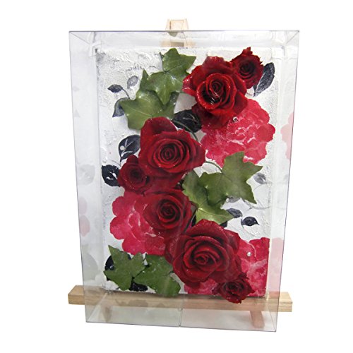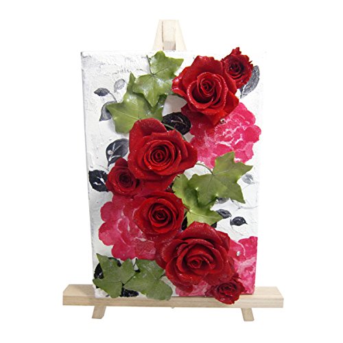 • キャンバスにプリザーブドフラワーの赤い薔薇と葉を手描きのアクリル画を合わせたキャンバスにアレンジです。専用ケースに入れてイーゼルに置く事ができます。