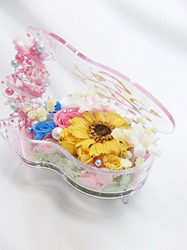 クリアピンクのグランドピアノに、黄色のガーベラとブルーとピンクの薔薇にジャスミンをアレンジしたキュートなアレンジ。明るい色合いのお花たちと白いジャスミンで華やかな可愛らしさと爽やかさを出しています。 パールのリボンが流れるメロディーをイメージし、スワロフスキーのキラキラとした輝きが美しいです。ピアノの蓋には音符模様をイメージした金模様のデザインがされています。記念日のお祝いや音楽を愛する方へおすすめです。 ■ご希望の方にはピアノに名前や数字、アルファベット大文字でイニシャルのシールをお付けいたします。