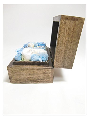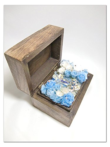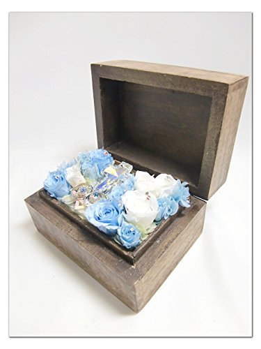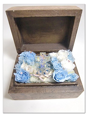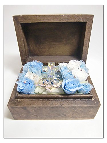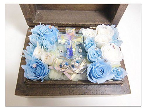 アンティークな風合いの木箱に、ブルーと白い薔薇にライトグリーンの紫陽花を使用。 目を引く中央の十字架はスワロフスキーを使用しています。キラキラの輝きがとても美しいです。純粋なピュアなイメージがとても神聖さを感じます。お花の模様が彫刻された木箱の蓋もとてもお洒落です。木箱を開けた瞬間ため息をつくような美しさにきっと喜んでいただけると思います。 ■アンティークな風合いの木箱のリングピロー。白とブルーの薔薇の中心には、スワロフスキーの十字架がきらきらと輝きを放ち神聖なイメージです。