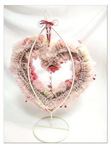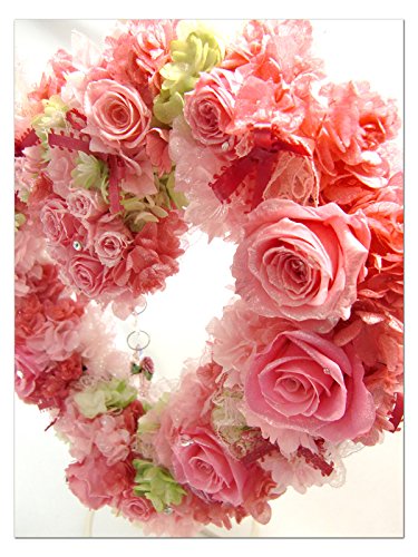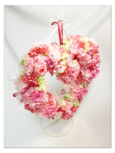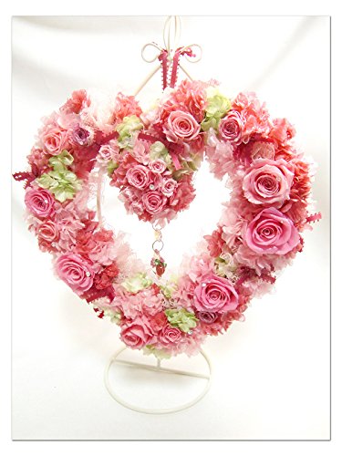 ピンクの薔薇をたくさん使った女の子らしくラブリーなハートリースです。土台の回りにはフリルレースリボンを飾り、リースの真ん中には、スワロフスキーとハートのチャームをペンダントのように飾りました。濃淡のあるピンクの薔薇にフリルのような紫陽花がとても綺麗です。アレンジの中には可愛らしいミニリボンも付けています。このリースは優しい気持ちや愛をテーマにしています。大切な方への贈り物にも、ぜひご利用ください。 ☆リースをかけれるスタンド付きです。 女の子らしく甘くラブリーな薔薇のハートリースです。デザインテーマは、優しい気持ちと愛。大切な方への想いを込めて、心和ませる贈り物としてもおすすめします。 ☆ご注文者様に商品ご発送の場合は商品の入る手さげ袋をお入れしております。