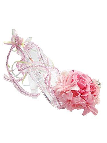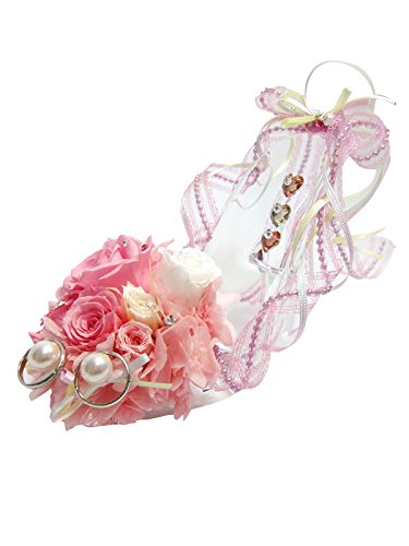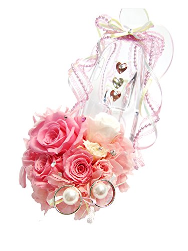 シンデレラのガラスの靴をイメージしたロマンチックなリングピローアレンジです。クリアな靴には、クリスタルのハートが3つ。ピンクと白の薔薇を飾り、ミニ薔薇やリボンを添えてボリューム感を出しました。朝露のように輝くスワロフスキーが綺麗。靴のまわりはビーズ調の繊細なリボンでふんわり華やかに飾りました。サイドのパール2個にリングをかけれます。甘く優しい雰囲気で、ご結婚のお祝いにおすすめです。 ☆ご注文者様に商品ご発送の場合は商品の入る手さげ袋をお入れしております。