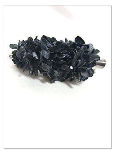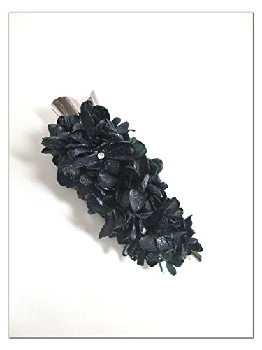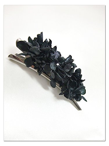 生花を加工したプリザーブドフラワーの、黒い紫陽花の髪飾りです。目立ちすぎない黒だから、どんなファッションにも自然にマッチ。それでいて髪に付けると確かな存在感があり、シックでエレガントな表情を添えてくれます。フリルのように沢山重なりあった花びらに、スワロフスキーが付いた3つの黒いリボンをアレンジして、ちょっとモダンなニュアンスをプラス!上級おしゃれアイテムとして活用していただけます。 お花の表面でキラキラ輝いているのは細かな粒子のラメ。美しいだけではなく、色移りや紫外線によるお花の色の変化を防ぎ、カビから守る機能も持っています!髪に付やすいクリップタイプにしていますので、普段使いのお洒落アイテムとして気軽にご利用ください。きっとヘビーローテーションのヘアアクセサリーになりますよ。 ☆ご注文者様に商品ご発送の場合は商品の入る手さげ袋をお入れしております。