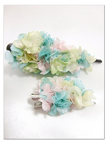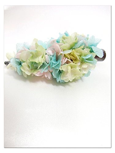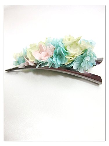 ☆ブルー、黄緑、ピンク。やわらかなパステルカラーの紫陽花を、コサージュのようにアレンジした美しい髪飾り。普段のおしゃれにも使いやすいクリップタイプです! ブルー、黄緑、ピンク。やわらかなパステルカラーの紫陽花を、コサージュのようにアレンジした美しい髪飾りです。サイズ違いの2点セットです。フリルのように重なり合った花びらからは、本物のお花を使ったプリザーブドフラワーならではの上質感が漂います。お色に濃淡を付けることで明るいリズムとニュアンスが生まれ、優しいながらも存在感ある仕上がりになっています。 花びらの表面では、微粒子のラメがキラキラときれい。お花の色によって輝き方が変わるのも素敵です。しかも、このラメには優れた機能があり、色移りや紫外線によるお花の色の変化をガード。いつまでもきれいなままでいて欲しい…という、お花への思いやりとしてお付けしています。髪に付やすいクリップタイプだから、便利に使えてシーンを選びません。パーティやアフターファイブの髪を、さりげなく華やかに!普段使いのお洒落にも、どうぞ。