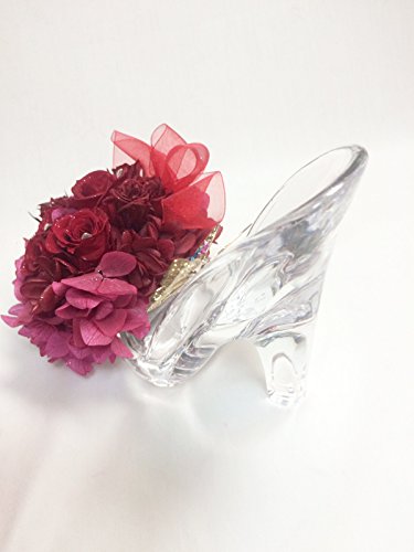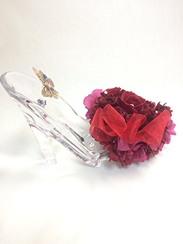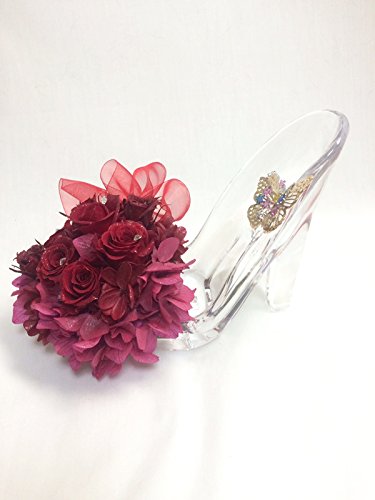 赤い薔薇ならではのハッとするような強い存在感を活かしたガラスの靴アレンジ。落ち着きのある大人の華やかさが魅力です。金色の蝶々を付けて美しく輝く女性のように、ときめく情熱を表しました。スワロフスキーの輝きと花びらの表面に施したラメは、とても細かい粒子を使っているので、目立ちすぎることなく、光によって見え方が変わる、キラキラと上品な輝きが素敵です。大切な方への贈り物や結婚のお祝いに、ぜひお選びください。