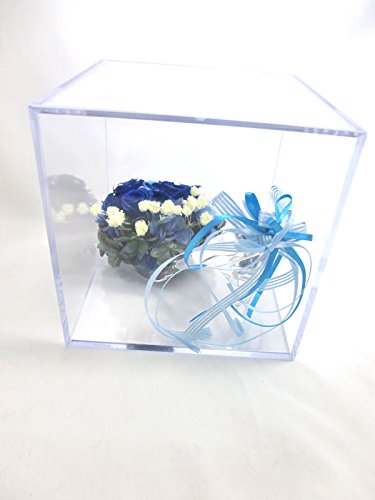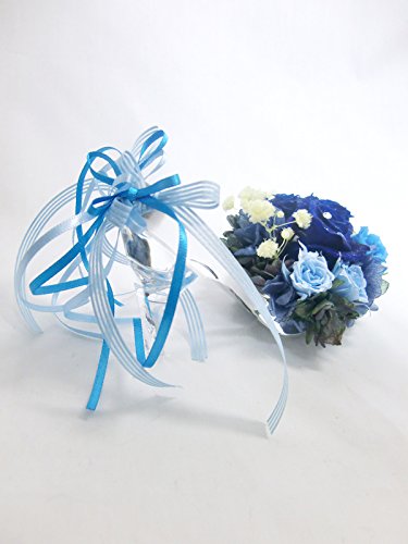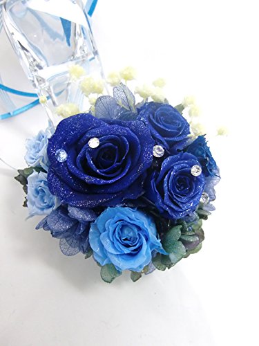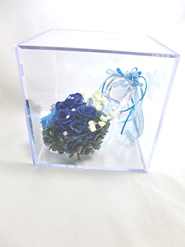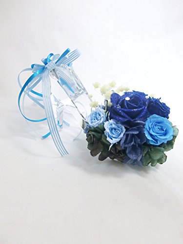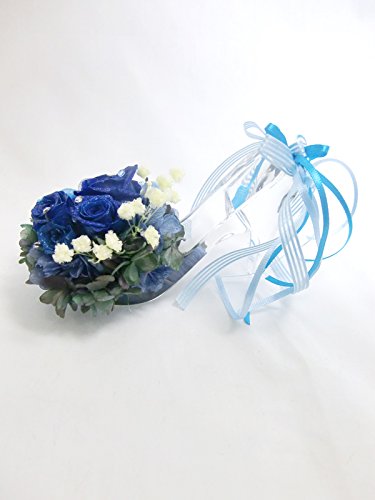 ☆「神の祝福」という素敵な花言葉を持つ神秘的な青い薔薇をシャープに華やかにアレンジ。本当のガラス素材の靴からは、ワンランク上の気品が漂います。 本当のガラス素材だけが持つ透明な輝きが美しい靴にプリザーブドフラワーならではの鮮やかな青い薔薇とブルーの薔薇を使用。薔薇は大きさを変えてアレンジし、神秘的で深みのある美しさを表現しました。かかと部分にはリボンをふんわりとつけています。 お花部分には上品な輝きの微粒子ラメをお付けしています。その輝きは宇宙に浮かぶ星のよう。青い薔薇の花言葉は「神の祝福」。お誕生日のプレゼントやウェディングのお祝いなどにおすすめです。 ガラスの靴はクリアキューブボックスの中に固定しているので外れません。プレゼントラッピングをしてお届けします。 ■ケース又はシューズにイニシャルやお名前のアルファベット大文字や日付けのシールをお付けできます。ご希望の場合は備考欄にご記入下さい。 シューズの方は幅が狭いので、シューズの方は幅が狭いので、イニシャルやお日にち程度の文字数の場合はおつけできますが、文字数が多い場合はケースにお付けいたします。