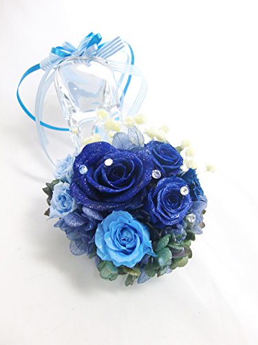 【プリザーブドフラワー/本当のガラスの靴シリーズ】シンデレラのガラスの靴に青とブルーの薔薇の神秘的な輝きとリボンを添えて【リボンラッピング付き 送料無料】
