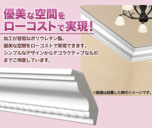 内装用モールディング。 壁の上端、天井との境目などに貼って、ゴージャス感やシックなたたずまいを表現する装飾材です。 ポリウレタン製の軽量製品のため、接着剤とビス止めで簡単に取付ができ、加工も容易です。下地塗装済みなので、仕上げに水性塗料を塗布するだけで施工ができます。 優美空間を簡単に、ローコストで実現できます。
