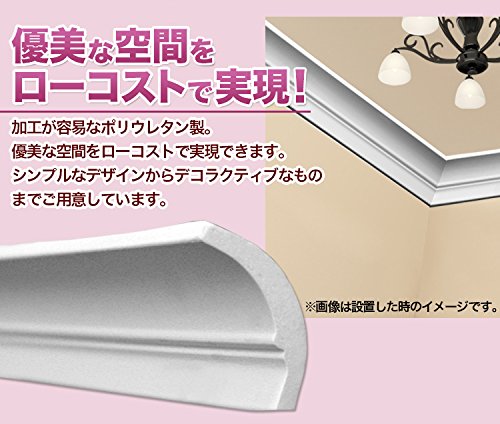 内装用モールディング。 壁の上端、天井との境目などに貼って、ゴージャス感やシックなたたずまいを表現する装飾材です。 ポリウレタン製の軽量製品のため、接着剤とビス止めで簡単に取付ができ、加工も容易です。下地塗装済みなので、仕上げに水性塗料を塗布するだけで施工ができます。 優美空間を簡単に、ローコストで実現できます。