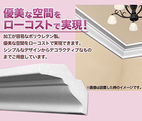 内装用モールディング。 壁の上端、天井との境目などに貼って、ゴージャス感やシックなたたずまいを表現する装飾材です。 ポリウレタン製の軽量製品のため、接着剤とビス止めで簡単に取付ができ、加工も容易です。下地塗装済みなので、仕上げに水性塗料を塗布するだけで施工ができます。 優美空間を簡単に、ローコストで実現できます。