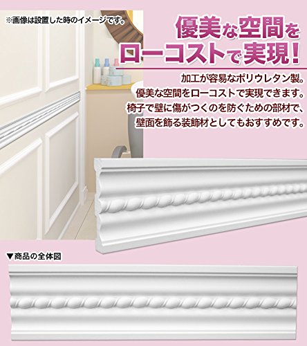 内装用モールディング「チェアレール 」。 壁材の繋ぎ目を隠したり、アクセントをつけたりするために、壁の中央部に貼る装飾材です。お好みの長さにカットして額縁を作ることもできます。 ポリウレタン製の軽量製品のため、接着剤とビス止めで簡単に取付ができ、加工も容易です。下地塗装済みなので、仕上げに水性塗料を塗布するだけで施工ができます。 優美空間を簡単に、ローコストで実現できます。