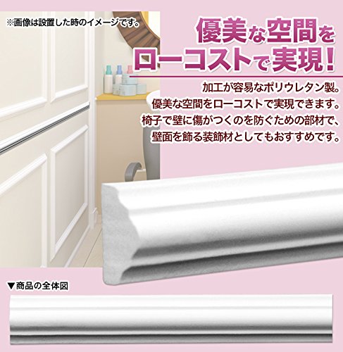 内装用モールディング「チェアレール 」。 壁材の繋ぎ目を隠したり、アクセントをつけたりするために、壁の中央部に貼る装飾材です。お好みの長さにカットして額縁を作ることもできます。 ポリウレタン製の軽量製品のため、接着剤とビス止めで簡単に取付ができ、加工も容易です。下地塗装済みなので、仕上げに水性塗料を塗布するだけで施工ができます。 優美空間を簡単に、ローコストで実現できます。