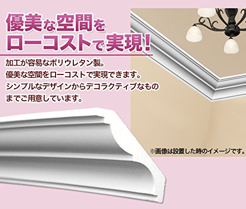 内装用モールディング。 壁の上端、天井との境目などに貼って、ゴージャス感やシックなたたずまいを表現する装飾材です。 ポリウレタン製の軽量製品のため、接着剤とビス止めで簡単に取付ができ、加工も容易です。下地塗装済みなので、仕上げに水性塗料を塗布するだけで施工ができます。 優美空間を簡単に、ローコストで実現できます。