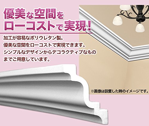 内装用モールディング。 壁の上端、天井との境目などに貼って、ゴージャス感やシックなたたずまいを表現する装飾材です。 ポリウレタン製の軽量製品のため、接着剤とビス止めで簡単に取付ができ、加工も容易です。下地塗装済みなので、仕上げに水性塗料を塗布するだけで施工ができます。 優美空間を簡単に、ローコストで実現できます。