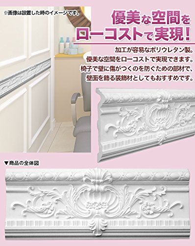 内装用モールディング「チェアレール 」。 壁材の繋ぎ目を隠したり、アクセントをつけたりするために、壁の中央部に貼る装飾材です。お好みの長さにカットして額縁を作ることもできます。 ポリウレタン製の軽量製品のため、接着剤とビス止めで簡単に取付ができ、加工も容易です。下地塗装済みなので、仕上げに水性塗料を塗布するだけで施工ができます。 優美空間を簡単に、ローコストで実現できます。