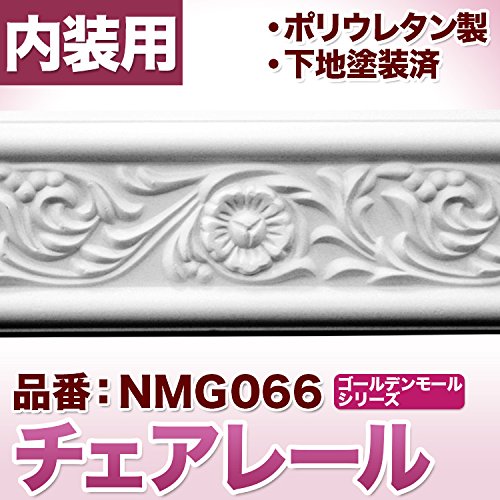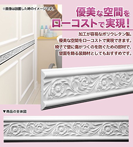 内装用モールディング「チェアレール 」。 壁材の繋ぎ目を隠したり、アクセントをつけたりするために、壁の中央部に貼る装飾材です。お好みの長さにカットして額縁を作ることもできます。 ポリウレタン製の軽量製品のため、接着剤とビス止めで簡単に取付ができ、加工も容易です。下地塗装済みなので、仕上げに水性塗料を塗布するだけで施工ができます。 優美空間を簡単に、ローコストで実現できます。