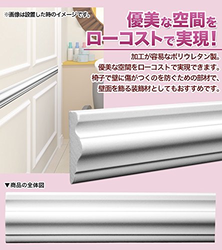 内装用モールディング「チェアレール 」。 壁材の繋ぎ目を隠したり、アクセントをつけたりするために、壁の中央部に貼る装飾材です。お好みの長さにカットして額縁を作ることもできます。 ポリウレタン製の軽量製品のため、接着剤とビス止めで簡単に取付ができ、加工も容易です。下地塗装済みなので、仕上げに水性塗料を塗布するだけで施工ができます。 優美空間を簡単に、ローコストで実現できます。
