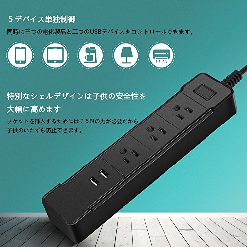 - •【コンセントAC電源 三連+ 二つのUSBポート】 最大出力10A、それぞれは最大1250W対応できます。同時に五つの電化製品をコントロールできますし、別々にON/OFFコントロールと識別名を指定可能です。