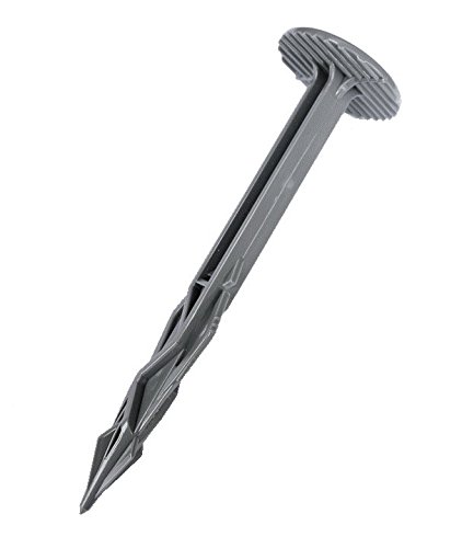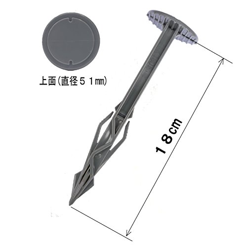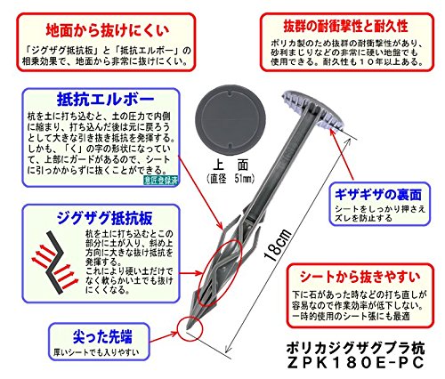 材質がヘルメットなどにも使用されているポリカなので抜群の強度と10年以上の耐久性があります。【ジグザグ抵抗板】と【弾力性のある抵抗エルボー】の相乗効果で大きな引き抜き抵抗を即効的に発揮し、地面から非常に抜けにくくなっています。 しかもシートからは抜けやすくなっているので、下に石があった時などの打ち直しが容易ににできるので作業効率が低下しません。工事現場などの一時的使用のシート張りにも最適です。軟らかい地盤から固い地盤まで、また道路などの法面、公園、メガソーラー(太陽光発電)用地など様々な環境と場所で使用できます。、意匠登録済の商品です。