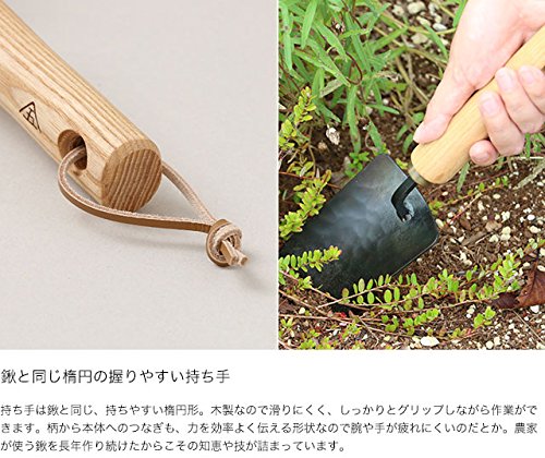 - 片刃包丁と同じ、鉄と鋼の二重構造刃。持ち手は鍬と同じ楕円の握りやすい持ち手。