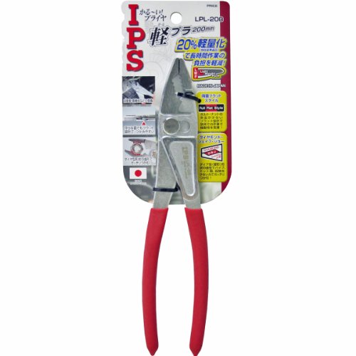 ●かる~い、プライヤ、軽(かる)プラ。●ダイヤ型形状の歯部とフラット設計により、優れた機動性を発揮。●当社従来品比で、20%軽量化。●強度を損なうことなく、軽量化を実現、長時間作業の負担を軽減。●平らな面でもフラット設計で、つかみやすい。●ボルト・ナットの突出が少ないフラット設計で狭所での作業で機動性を発揮。●ダイヤ型(菱形)形状の歯型で、パイプ、ナット類、板物を少ない力でガッチリつかむ。●製品サイズ/縦:203mm横:47mm高さ:13mm●製品重量:200g●パッケージサイズ/縦:245mm横:75mm高さ:19mm●パッケージ重量:215g●生産国:日本●材質:S55C●用途:自動車、農機具などの整備●呼び寸法:200mm●全長:203mm●歯部厚み:10mm●最大口開き幅:25mm●口開調節:2段階●重量:200g●切断可能径:2.6mm●両面フラット設計●歯部ダイヤ型形状●こちらの商品はメーカー注文品に付き、商品の発送までに約3日~1週間ほどお時間が掛かります。納期は、ご注文後、追って御連絡させて頂きます。