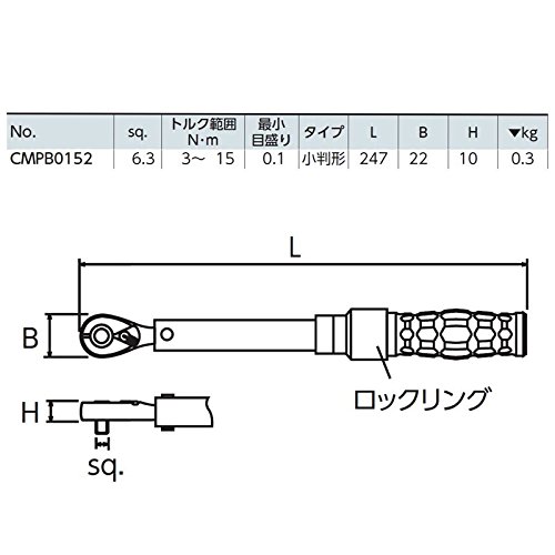●測定しようとするトルク値をあらかじめ設定できるので、連続して作業を行う場合や目盛りの読み取りが困難な場所で使用する時に効果を発揮します。 ●独自のプレセット機構で、測定トルク値の設定は端数値まで正確かつ容易に行えます。 ●測定値設定後のロック機構付きです。 ●小型部品等の小トルク連続締め付けに有効です。 ■型式:CMPB0152 ■メーカー:KTCの(京都機械工具株式会社) ■差込角:6.3sq.(1/4) ■トルク範囲N・m:3~15 ■最小目盛り:0.1 ■タイプ:小判形 ■全長:247mm ■ヘッド幅:22mm ■重量:0.3kg