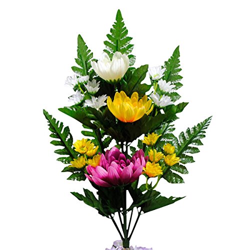 - ◆華やかでいて落ち着きのある仏花。お仏壇だけでなくお墓参りにもオススメです。造花なので、腐らず手入れも不要。また、虫がよらないのも便利です。※写真の花台や小花は付属しません。