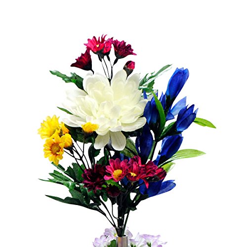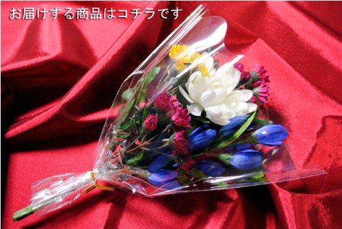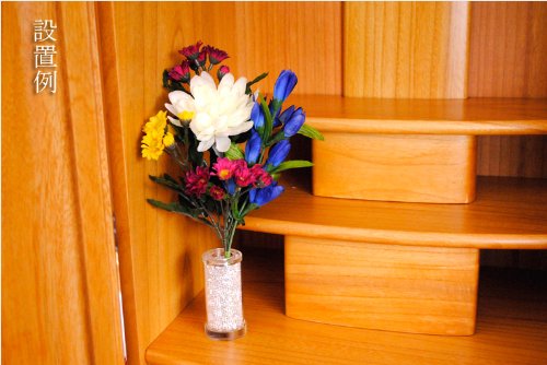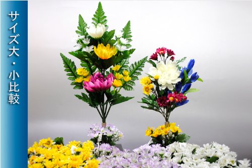 - ◆華やかでいて落ち着きのある仏花。お仏壇だけでなくお墓参りにもオススメです。造花なので、腐らず手入れも不要。また、虫がよらないのも便利です。※写真の花台や小花は付属しません。