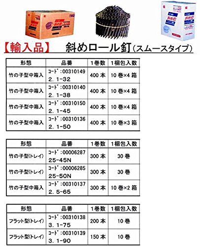 斜めロール釘 スムース 輸入品 2.5-65mm 300本×10巻×2箱 竹の子型