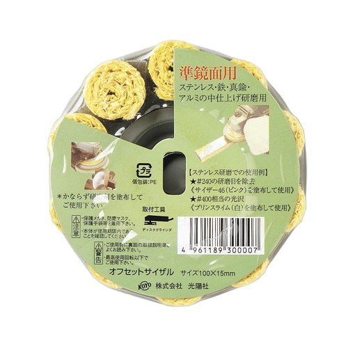 ●ステンレス・鉄・真鍮・アルミの中仕上げ研磨に最適です。●【用途】●ステンレス・鉄・真鍮・アルミの中仕上げ研磨用。●【機能・特徴】●従来のポータブル研磨工具より高速回転で研磨でき、驚異的な研磨力があります。●ユニットタイプのため、加工物へのなじみ性があると同時にバフ面が固まりにくく安定した研磨効果が得られます。●バフ研磨剤の選定により、240番の研磨目を除去する粗磨きから、400番相当までの研磨仕上げが可能です。●【商品サイズ】幅100×高さ15mm●商品コード:4961189300007●JANコード:4961189300007●ブランド名:KOYO●商品名:オフセットサイザル