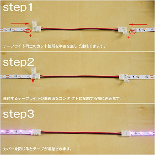 ※テープライトの“+-”とコネクタ部分の“+-”を合わせて差し込んでください,もし点灯しない場合は逆になっている可能性がございます。