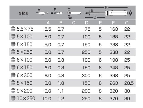 ●握りやすく、力が入りやすい4本溝ハンドルのプラスチック柄ドライバーです。マグネット入タイプ:レギュラータイプ呼称:-5×250先端サイズ(マイナス):5.0×0.7mm軸長:250mm軸径:5mm全長:338mm●パッケージサイズ/縦:22mm横:22mm高さ:338mm