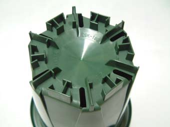 スリット鉢18cmの厚手でロングタイプです。色はモスグリーンです。スリットが外から見えないタイプです。サイズは外形18cmx高さ20cm(内径14.7cmx高さ18.5cm)です。足の高さが約1.1cmありますので停滞水を完全除去出来ます。