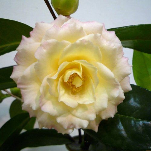 - 椿(つばき)「新世紀」の苗木を販売。淡い黄色の八重ツバキです。 椿「新世紀」は、黄の旋律の枝変わり品種です。淡い黄色の花弁の周囲にうっすらと紅色が入ります。花の形は黄の旋律と同じです。八重咲きの黄色椿は珍しく、ふっくらとして美しい椿です。 やや寒さに弱いので冬季間は室内で管理してください。