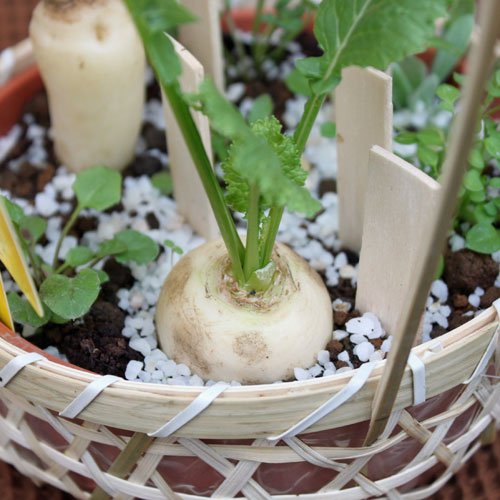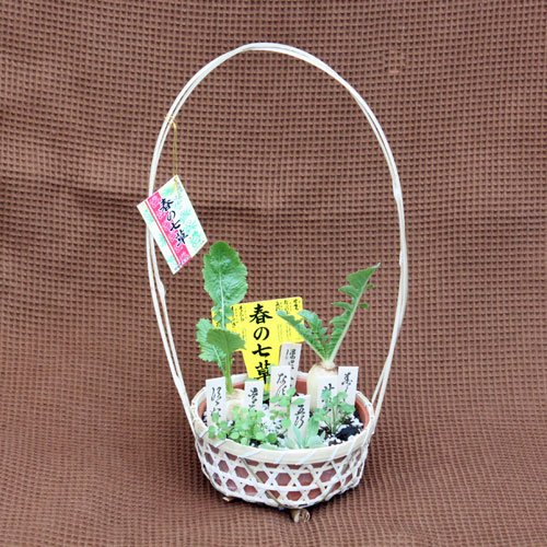 - 七草を籠に植えた寄せ植えです。ミニサイズのすずな(カブ)、すずしろ(ダイコン)も入ってかわいい仕立てです。