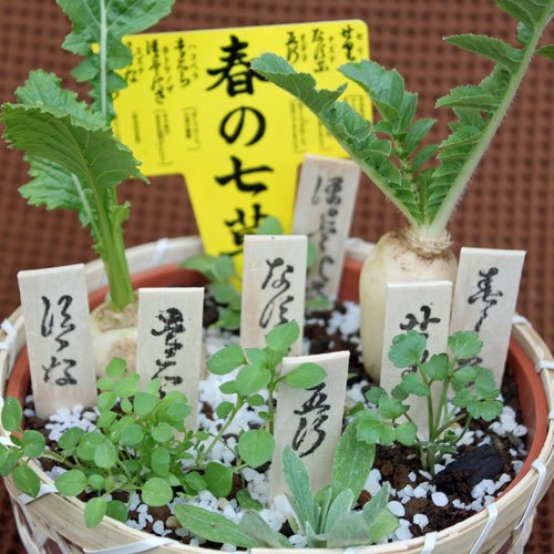 - せり(芹)、なずな(薺)、ごぎょう(御形)、はこべら(繁縷)、ほとけのざ(仏の座)、すずな(菘)、すずしろ(蘿蔔)、人日の節句(1月7日)の朝に、この7種の野菜が入った「七草粥」を食べると邪気を払い万病を除くと古くから言い伝えられています。