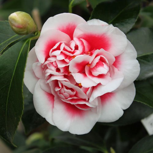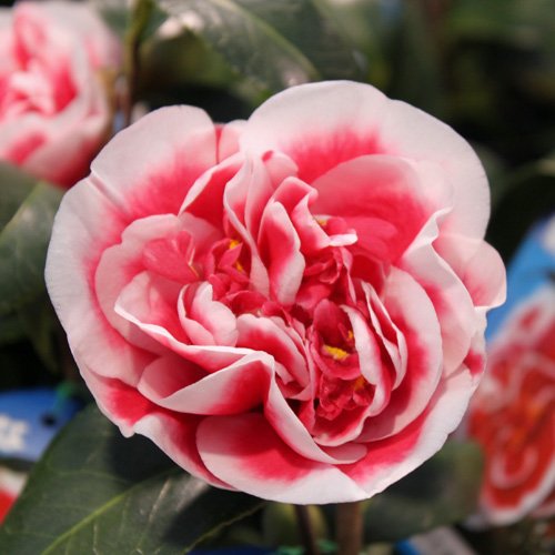 - 花色:紅色に白覆輪/花形:八重牡丹咲き/大きさ:大輪(9~11cm)