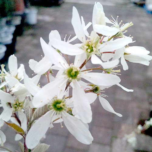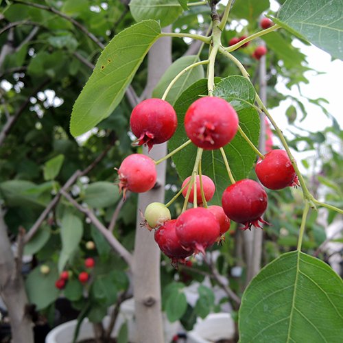 - 実だけでなく、庭木としても楽しめます。小さな甘い実は生食やジャムとしてお楽しみいただけます。沢山咲く白い花、初夏にたわわに実り、赤から黒色に美しく変化する果実、秋の紅葉、美しい樹形と、四季を通じて楽しむことができ、シンボルツリーにも人気の果樹です。実はヒヨドリなど小鳥の好物なので鳥寄せの木としても利用できます。別名「アメリカザイフリボク」とも呼ばれています。