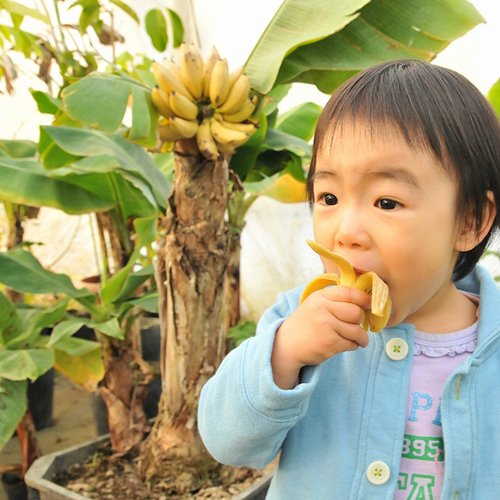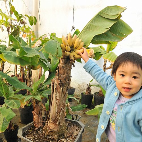 - 幹高60~80cmほどから実る極矮性バナナです。生長し葉数40枚を超すころから花を咲かせ実をつけます。果実が丸くなってきたら収穫し、追熟させ黄色くなったら食べられます。