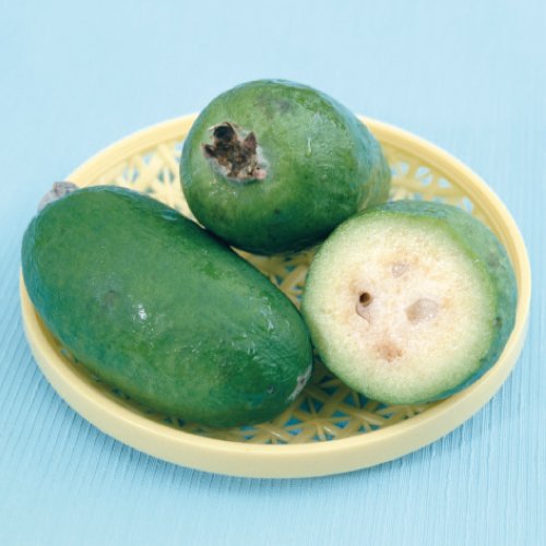 - フェイジョアは南米原産の「パイナップルグァバ」とも呼ばれる香り高い果物(くだもの)。初夏に咲く白い花弁に真紅の雌しべが目立つエキゾチックな美しい花と葉裏のシルバーリーフが魅力的です。収穫後追熟させた果実はキウイと桃を合わせたような味で、ジューシーで甘酸っぱく生食やジャムにして楽しむことができます。白い花弁の部分が甘く食用になります。