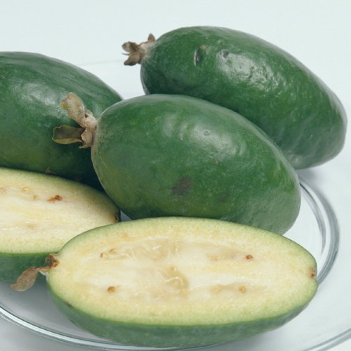 - フェイジョアは南米原産の「パイナップルグァバ」とも呼ばれる香り高い果物(くだもの)。初夏に咲く白い花弁に真紅の雌しべが目立つエキゾチックな美しい花と葉裏のシルバーリーフが魅力的です。収穫後追熟させた果実はキウイと桃を合わせたような味で、ジューシーで甘酸っぱく生食やジャムにして楽しむことができます。白い花弁の部分が甘く食用になります。
