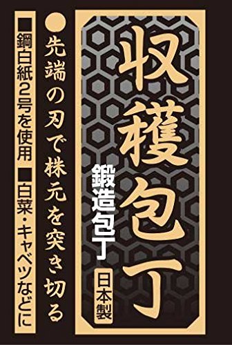 ●【用途】収穫包丁。●【機能・特長】レタスやキャベツ・白菜の収穫に最適です。先端の刃で野菜の株元を突き切るようにして使用します。●刃部:鋼付。●柄:木。