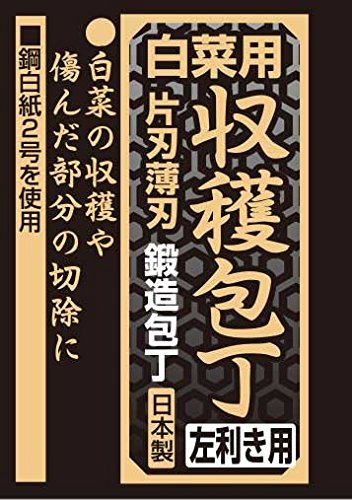 ●【用途】収穫包丁。●【機能・特長】白菜の株元部の不要な部分を効率よく切り落とせる白菜専用の収穫包丁です。刃を曲げているので、不要な部分を効率よく落とせます。左利き用です。●刃部:鋼付。●柄:木。