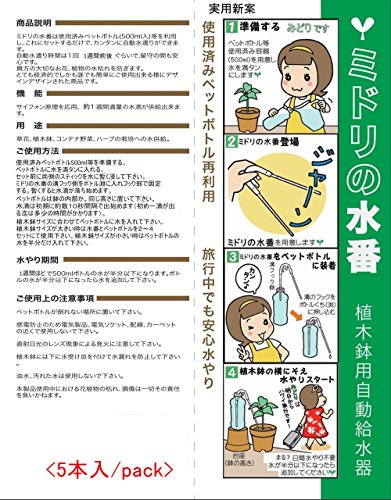 ミドリの水番は使用済のペットボトル(500ml)等を利用し、これにセットするだけで、カンタンに自動水やりができます。自動水やり時間は一回一週間前後ぐらいで、留守の間も安心です。貴方の大切なお花、植物の水枯れを防ぎます。とても経済的でしかも簡単にご使用出来る様にデザインされた商品です。