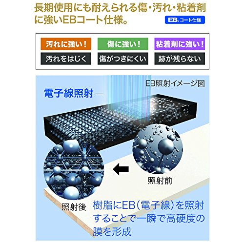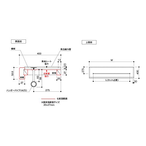 - 仕様 : 棚板 : MDF、上面=無地シート、下面=特殊硬化コート紙(EBコート仕様)/前框 受桟 : 集成材、LVL、特殊加工化粧紙/雑巾摺 : 発泡樹脂/パイプ : ステンレス巻/ブラケット : 亜鉛ダイキャスト