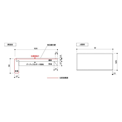 - 仕様 : 棚板 : パーティクルボード、上面=特殊硬化コート紙(EBコート仕様)、下面=パーティクルボード素地/前框 : 集成材、LVL、特殊加工化粧紙/受桟 : MDF素地/雑巾摺 : 発泡樹脂