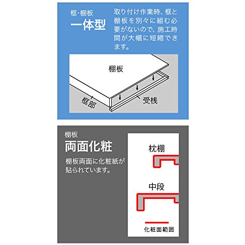 - 仕様 : 棚板 : 集成材、MDF、オレフィンシート/受桟 : 集成材、LVL、特殊加工化粧紙/雑巾摺 : 発泡樹脂