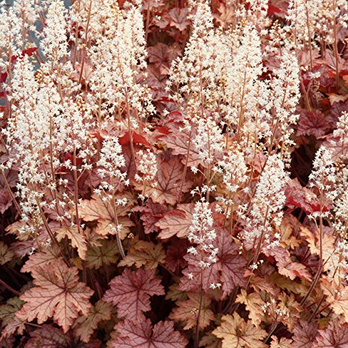 - Heucherella Honey Rose 草丈20cm、明るい赤褐色の切れ込みのある葉に白いブラシ状の花。