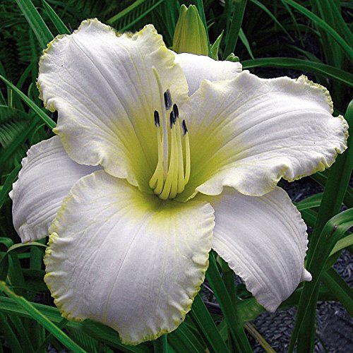- Hemerocallis Blizzard Bay 草丈65cm、清楚な白い花弁に淡いクリームイエローの縁取りと芯を持つ。大輪で常緑タイプ。